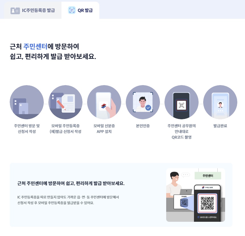 - QR코드 방식: 주민센터 방문 후 QR코드 스캔을 통해 모바일 주민등록증 발급 신청 가능